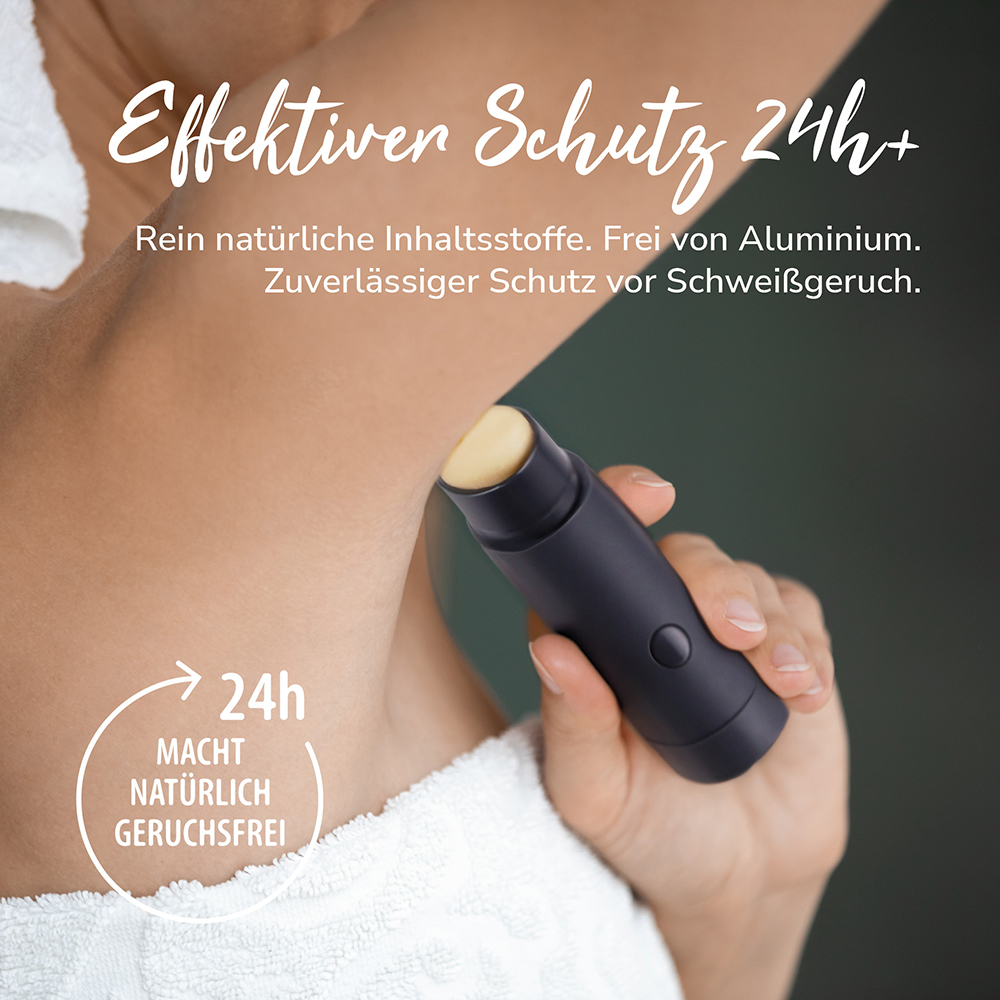 Streiche zweimal mit dem Deodorant über deine Achseln für 24h natürliche Frische und starken Schutz vor Schweißgeruch.