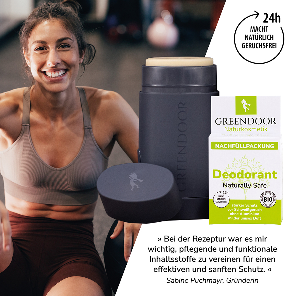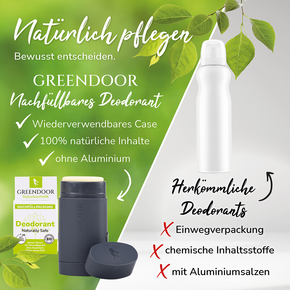 Sie erhalten: 1 Nachfüller Deodorant naturally safe (funktioniert nur mit einem bereits vorhandenen GREENDOOR Deodorant Nachfüllsystem)
