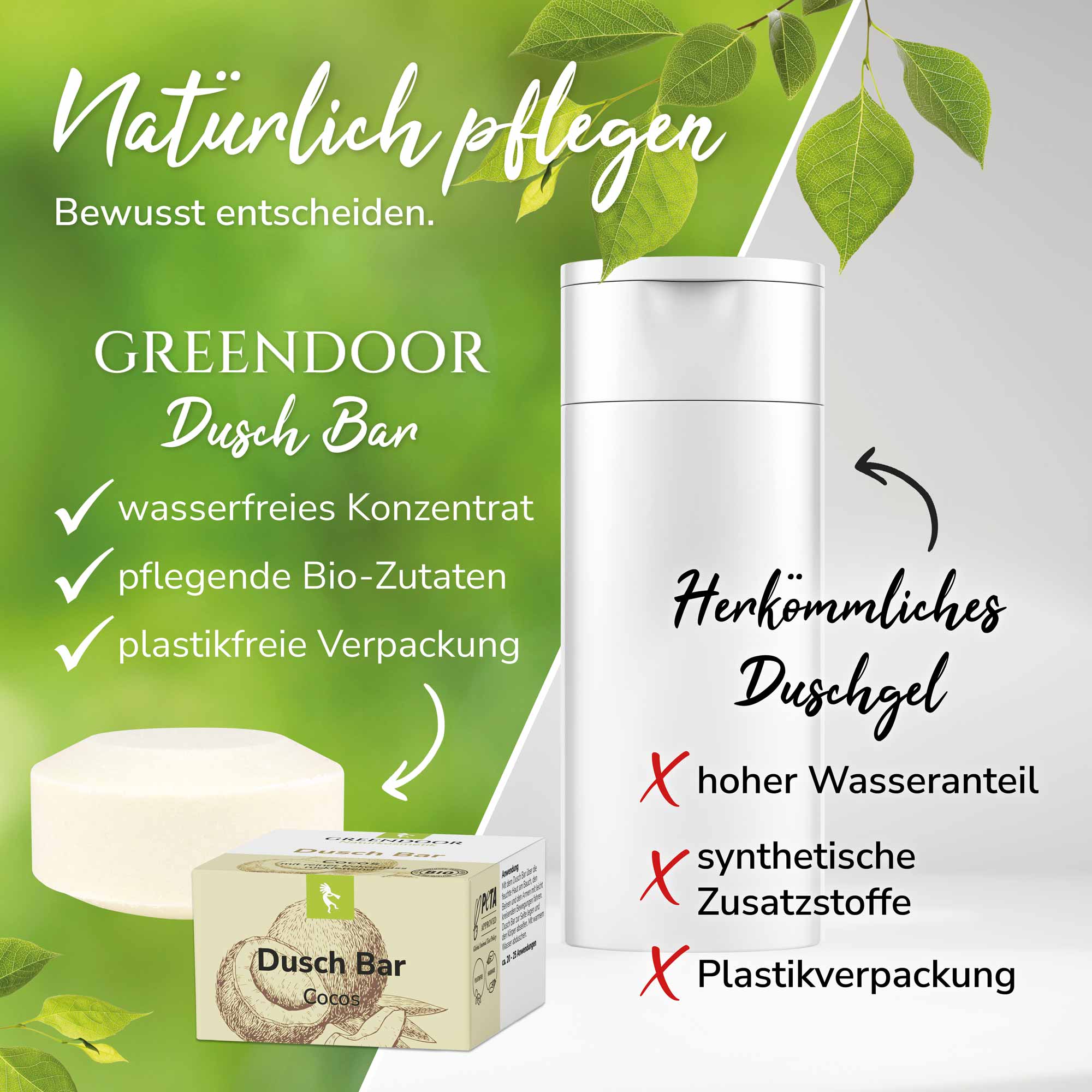 Der GREENDOOR Dusch Bar ist ein Duschgel - nur ohne Wasser! Dafür enthält er eine konzentrierte Ladung natürlicher Pflege für Ihre Haut aus Bio Kokosnüssen, Bio Sheabutter, Bio Sesamöl, Bio Kakaobutter, Kieselerde, Molke und Aloe Vera. Sie verzichten nur auf Wasser und damit auf Konservierungsmittel, Emulgatoren, Plastik und Silikone. Der Dusch Bar duftet natürlich fein nach Kokosnuss.