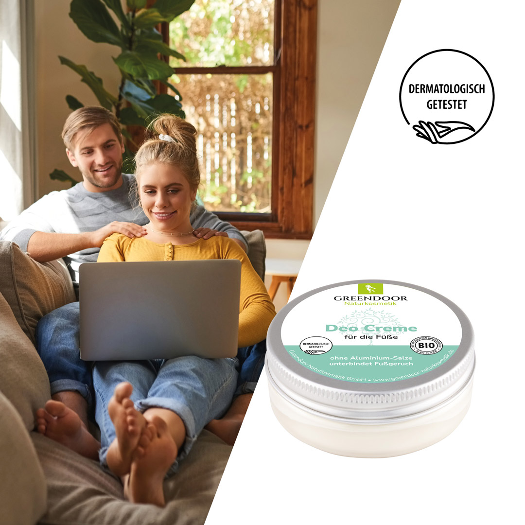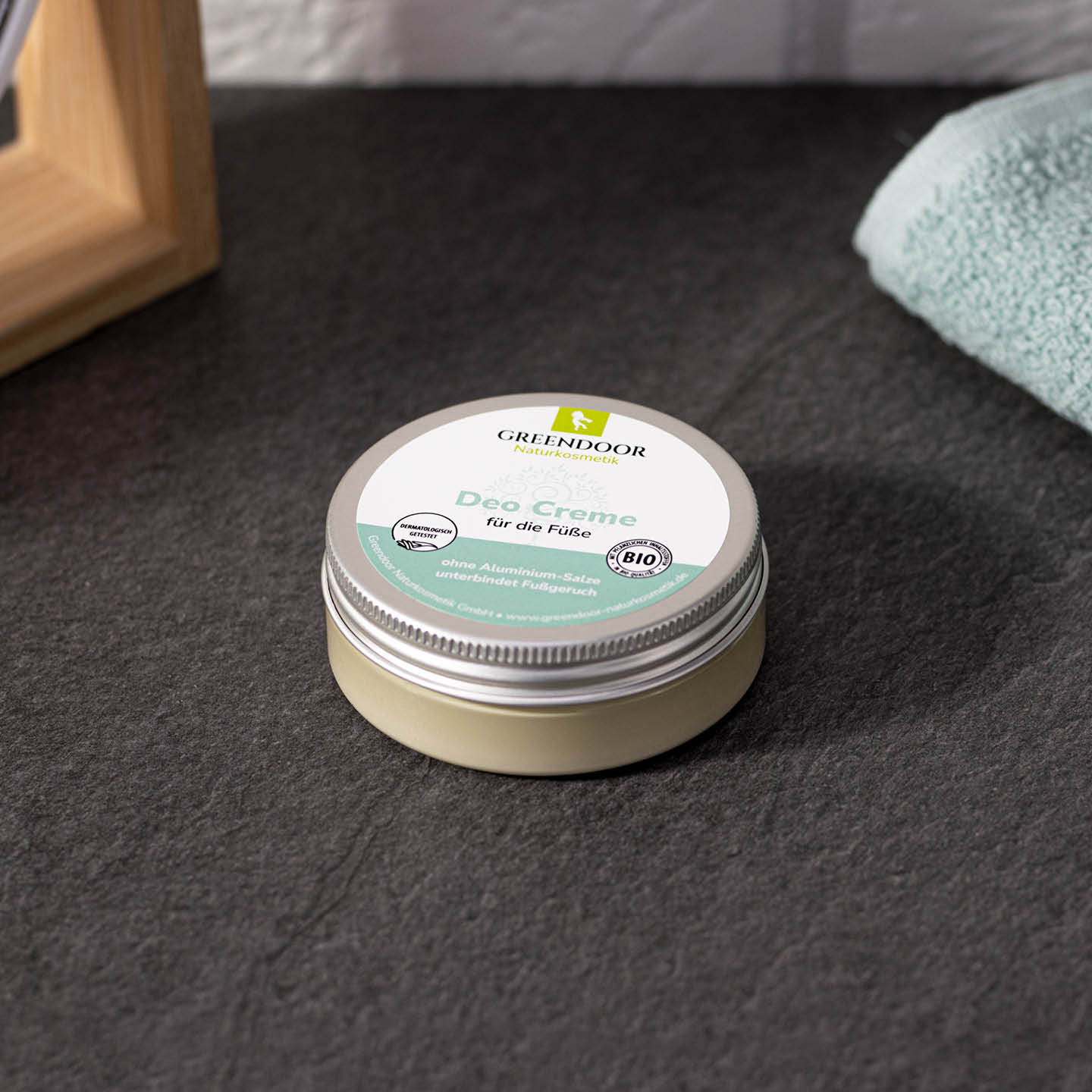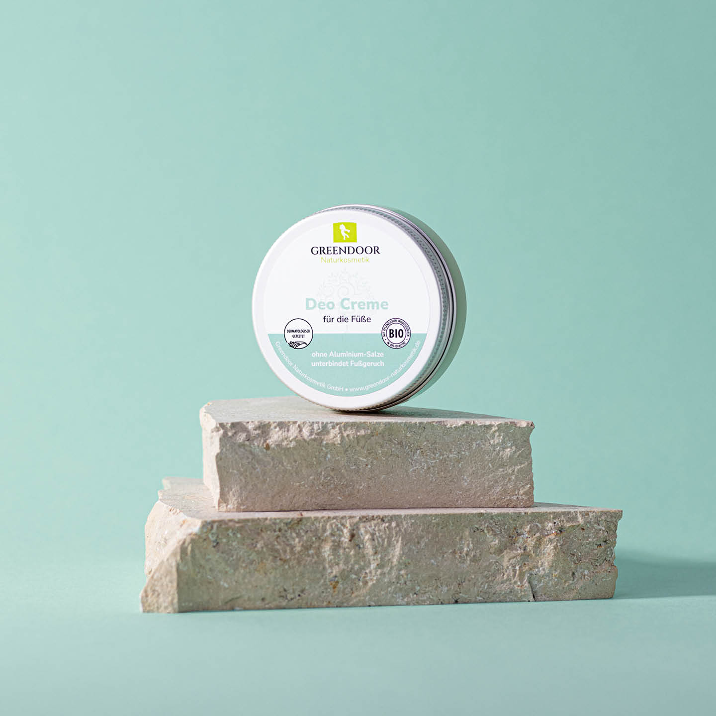 Die Fuß Deo Creme von GREENDOOR schützt Sie nachhaltig vor unangenehmem Fußgeruch. Die Alpha- und Beta Säuren von Bio Ajovan Früchten und Hopfen enthalten antiseptische Kräfte und beugen unangenehmer Geruchsbildung bei der Schweißzersetzung vor. Echter Salbei (Salvia Officinalis) und seine adstringierende Wirkung hemmt überschießende Schweißproduktion. Die Formulierung aus Bio Ölen, Aloe Vera und Kieselerde pflegt die beanspruchte Haut Ihrer Füße, der reine ätherische Duftkomplex spendet Frische und vitalisiert.