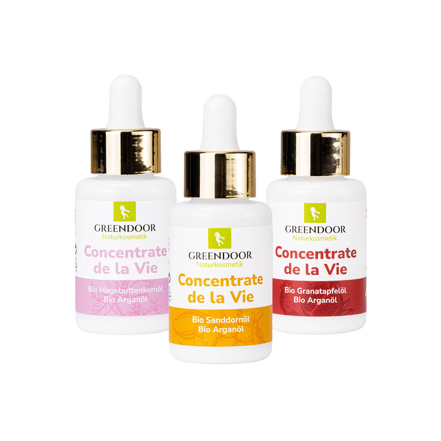 Nur die beste Basis zur Lösung der biologischen Konzentrate sorgt am Ende für das bestmögliche Ergebnis: GREENDOOR Bio Arganöl. GREENDOOR Bio Argan Öl aus ungerösteten Arganmandeln jeweils kombiniert mit Bio Hagebutte, Bio Sanddorn und Bio Granatapfelsamenextrakt versorgen Ihre Haut optimal mit Vitaminen, ungesättigten Fettsäuren, Carotinoiden und natürlichen Antioxidantien. Wir empfehlen GREENDOOR Concentrate bei reiferer Haut ab 40 zur Unterstützung der Zellregeneration und Vorbeugung von Falten, sowie zur unterstützenden Hautpflege bei Neurodermitis, Ekzemen und unreiner Haut.