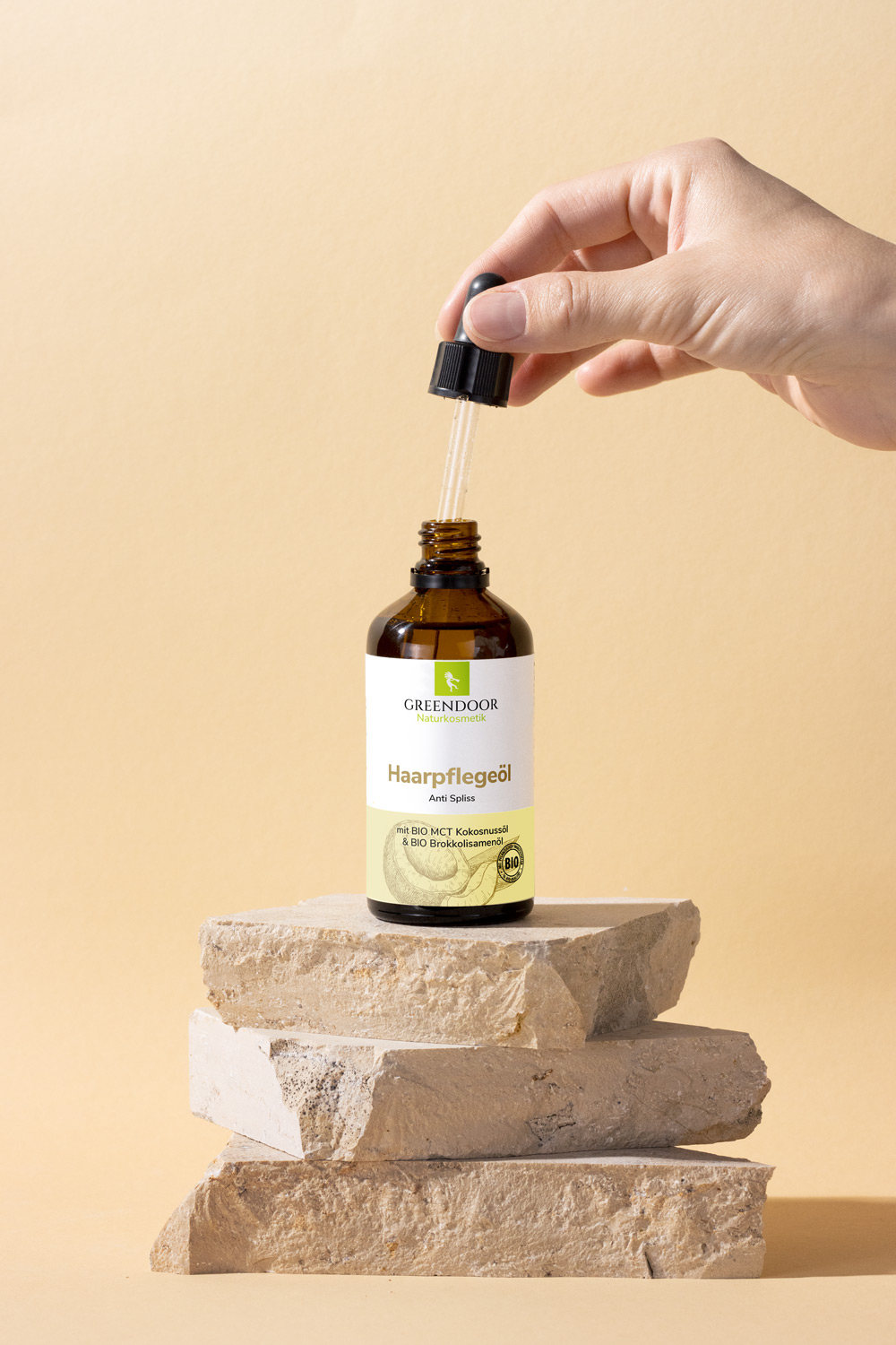 - Vor der Haarwäsche als Kur: Verteile 3-5 Tropfen GREENDOOR Haarpflegeöl in Deiner Handflächen und knete es gleichmäßig ins Haar ein. Bei trockener Kopfhaut empfehlen wir, die wertvollen Öle in die Kopfhaut einzumassieren. Nach einer kurzen Einwirkzeit führe wie gewohnt eine Haarwäsche mit einem milden Shampoo durch.