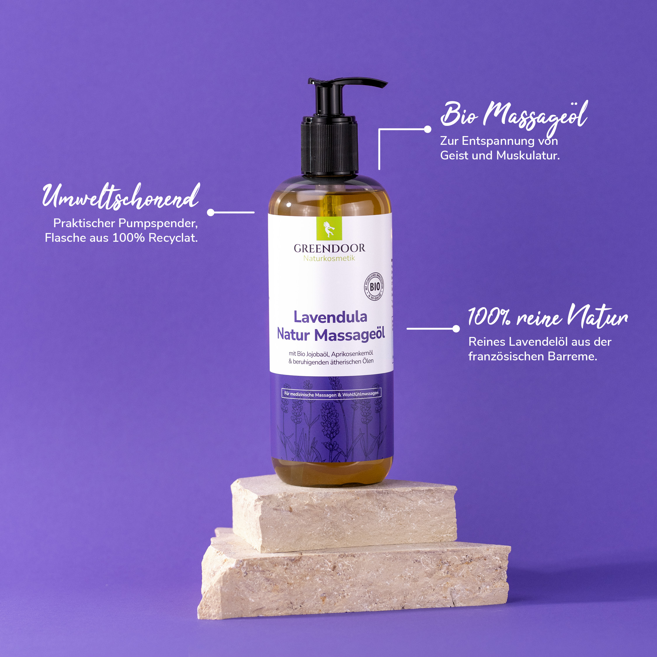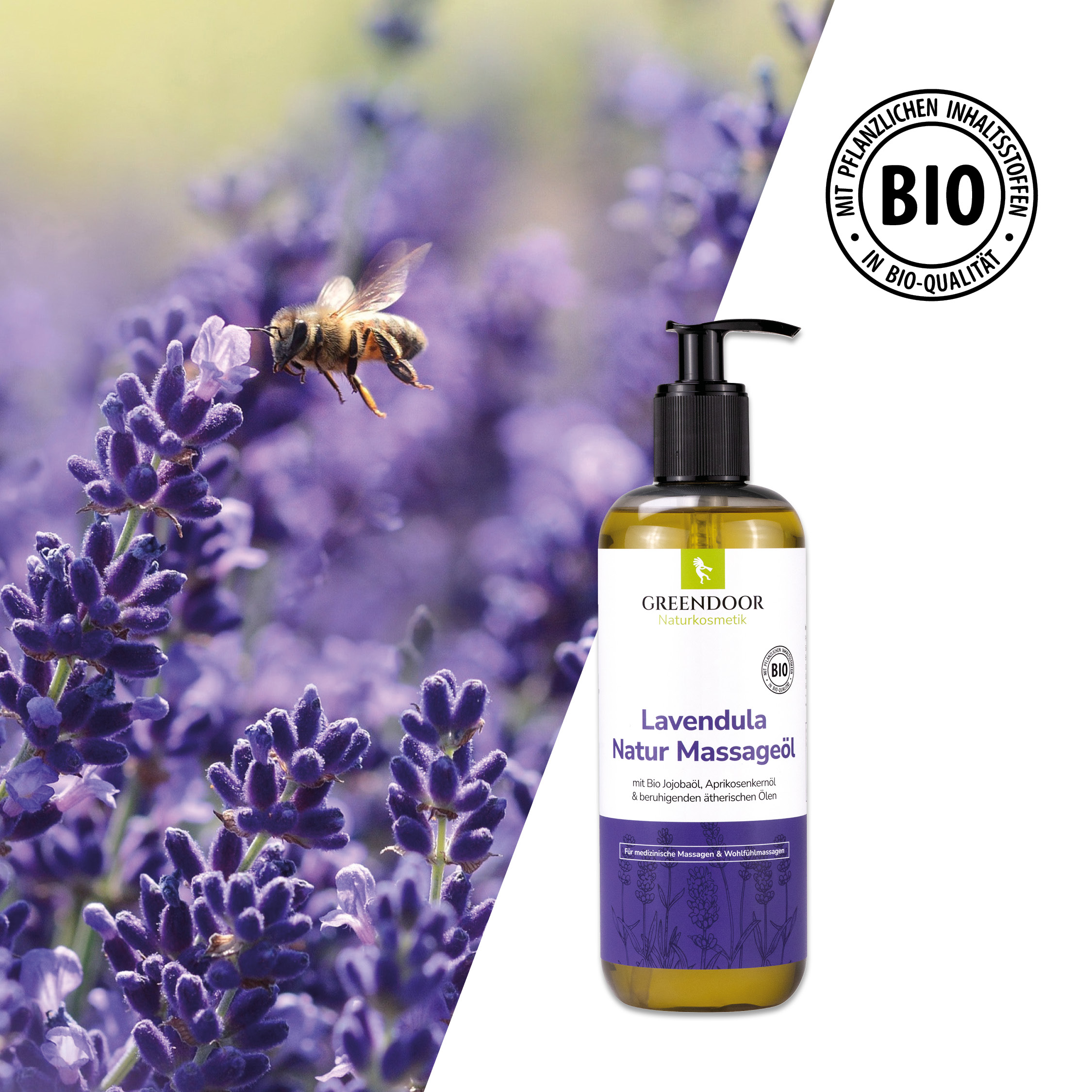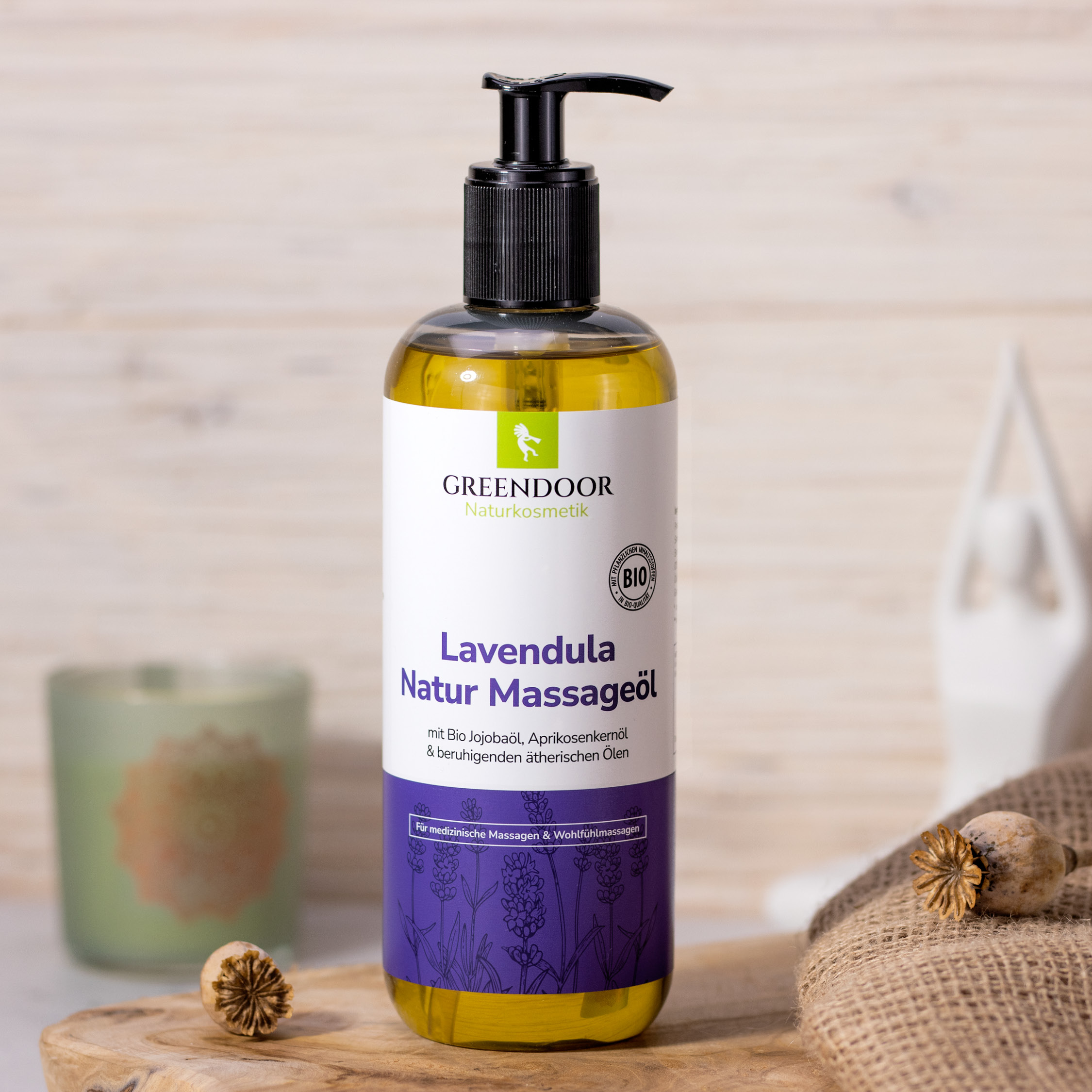 GREENDOOR Natur Massageöl mit Lavendelöl aus der französischen Barreme ist ein reiner natürlicher Genuß auf der Haut. Lavendel entspannt den Geist - genau das richtige nach einem anstrengenden Arbeitstag.