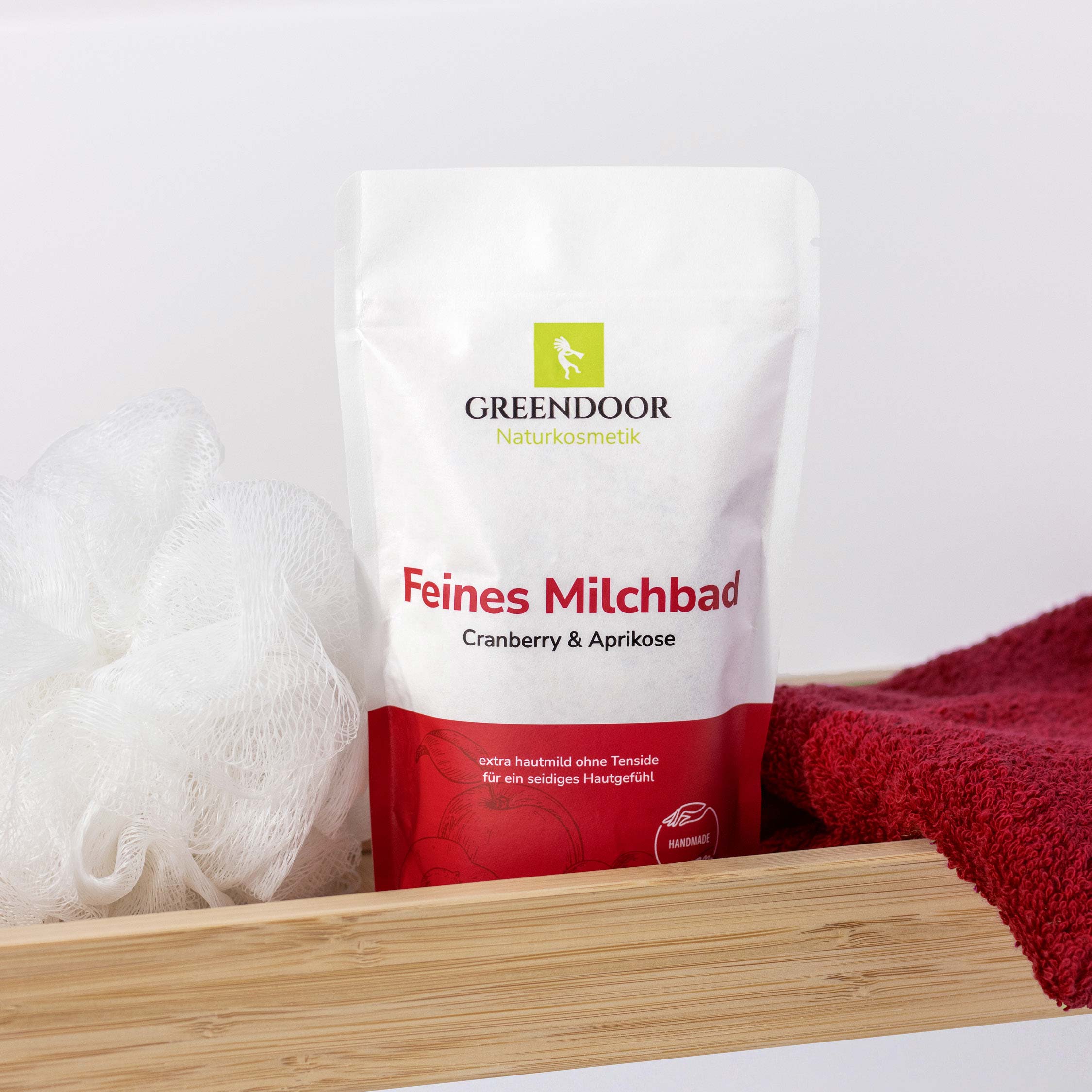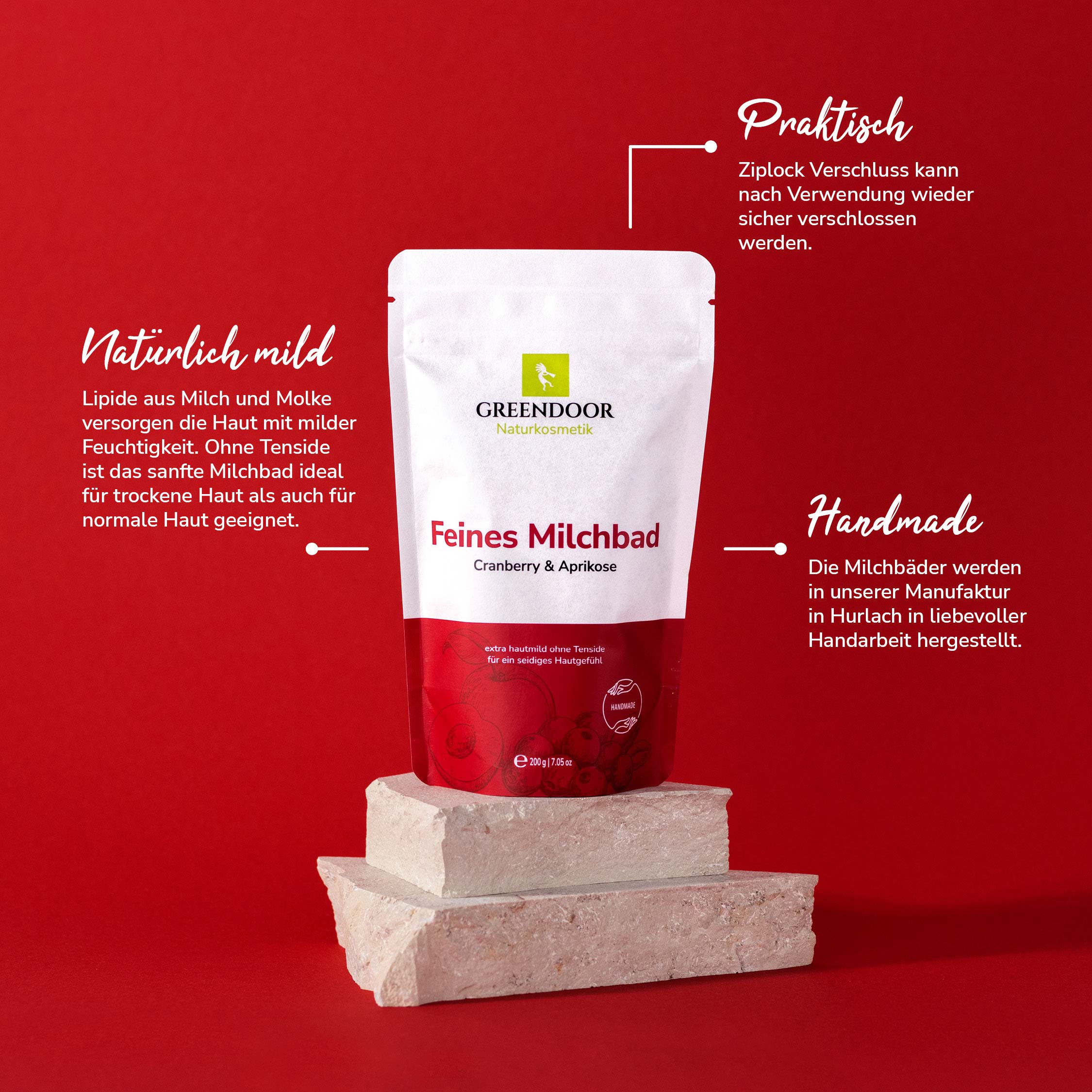Ein wohltuendes feines Milchbad mit fruchtigen natürlichen Zusätzen von Cranberry und Aprikose. Milch, Molke und Meersalz pflegen die Haut samtweich. Die Farbe stammt vom Cranberrypulver, das Badewasser wird hiervon jedoch nicht gefärbt.