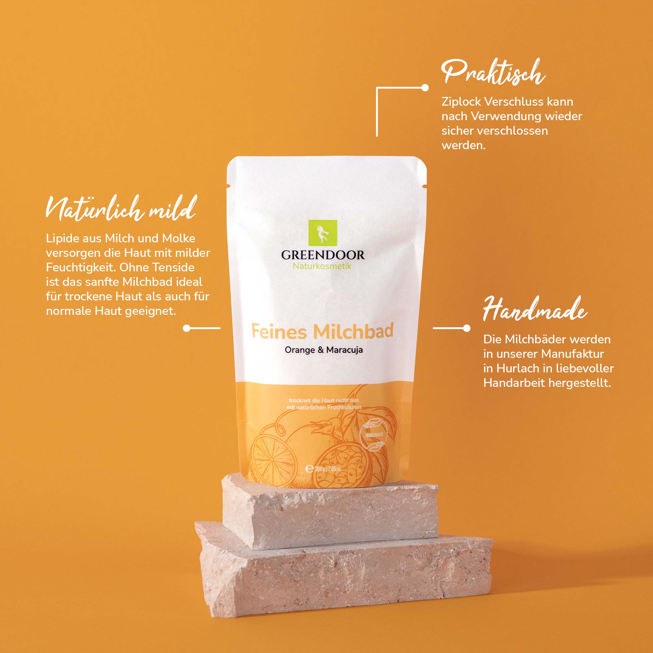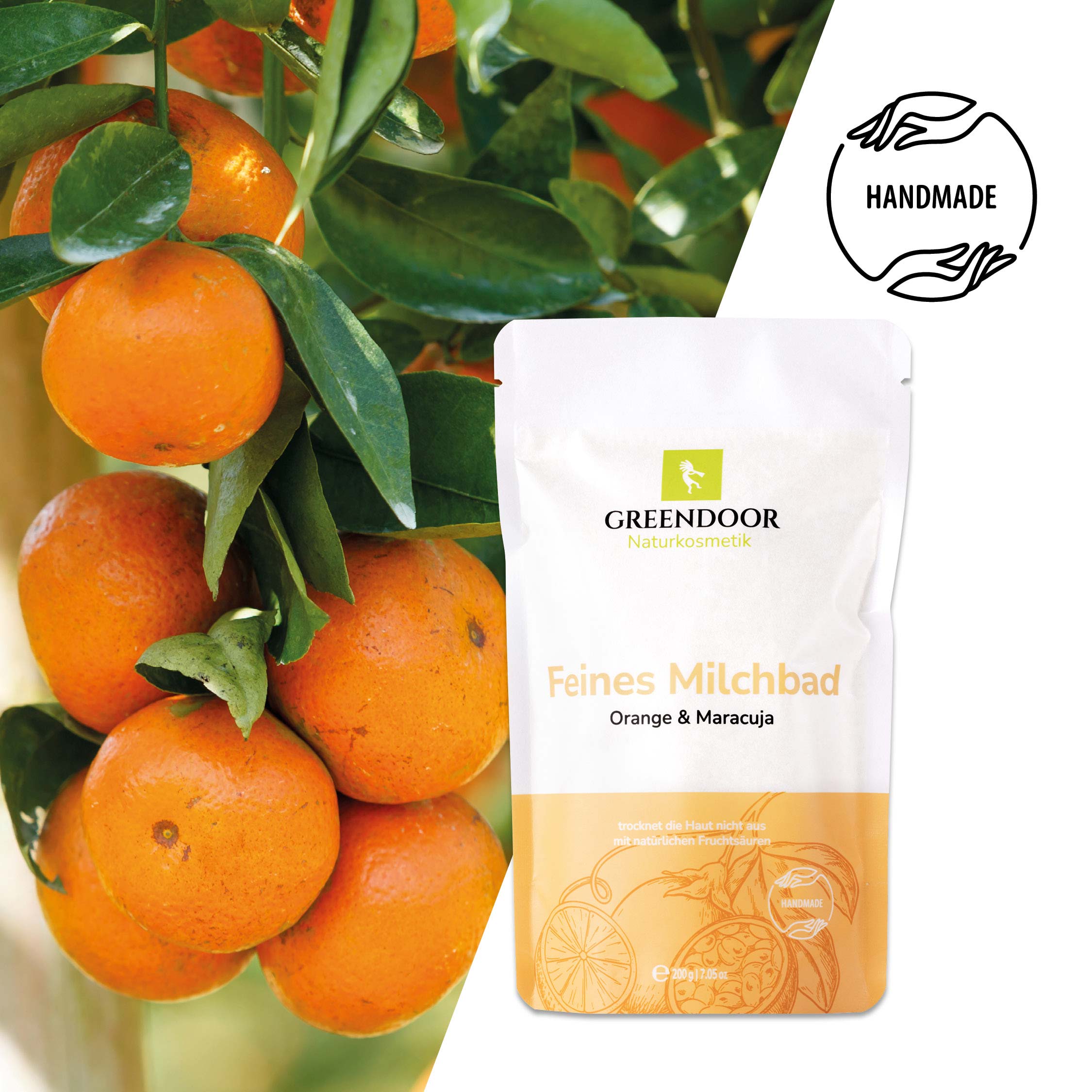 Die Sorte Maracuja Orange ist ein zart nach frischer Maracuja und fruchtiger Orange duftendes Milchbad. Milch, Molke und Meersalz pflegen die Haut samtweich. Tropische Maracuja, konzentrierter Orangensaft und fruchtiges Orangenöl sorgen für ein Bad, das für positive Stimmung sorgt. GREENDOOR Milchbäder sind auch sehr gut für Kinder geeignet, da sie keinerlei austrocknende Zutaten enthalten.