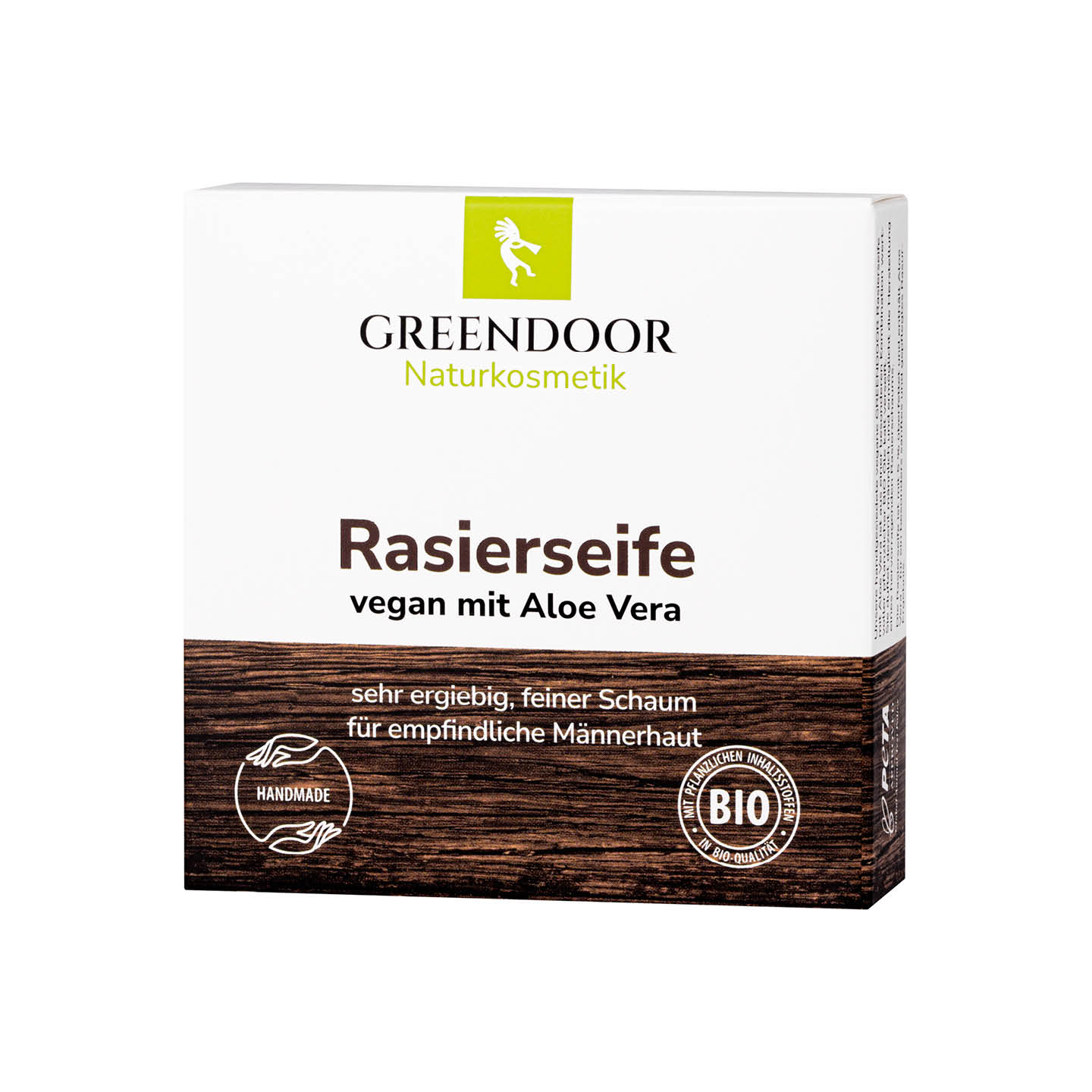Die GREENDOOR Rasierseife vegan ist mit 5% überfettet und enthält Aloe Vera - für ein besonders sanftes und gepflegtes Rasur Ergebnis.