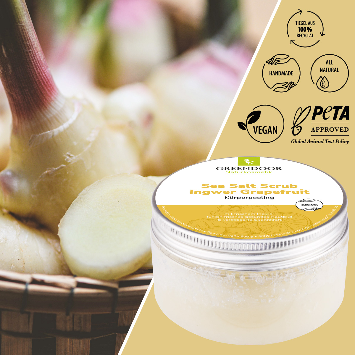 ... dürfen Sie beim GREENDOOR Sea Salt Scrub Ingwer Grapefruit erwarten. Ingwer ist besonders vitalisierend und exotisch erfrischend. Zudem wirkt Ingwer entzündungshemmend. Der Duft wird harmonisch durch ätherisches Grapefruitöl abgerundet und beeinflusst das Wohlbefinden positiv.