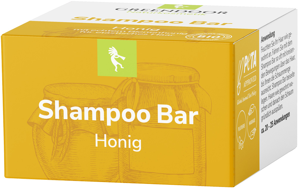 Der GREENDOOR Shampoo Bar Honig liefert dem Haar konzentrierte Haarpflege aus Bio Sheabutter, Bio Brokkolisamenöl, Bio Kakaobutter, Bio Kokosöl, Molke, Aloe Vera und echtem Bienenhonig. Dieses Haarshampoo ist ohne Wasser, ohne Konservierungsmittel, ohne Sulfate, ohne PEG's, ohne Emulgatoren, ohne Plastik und ohne Silikone.