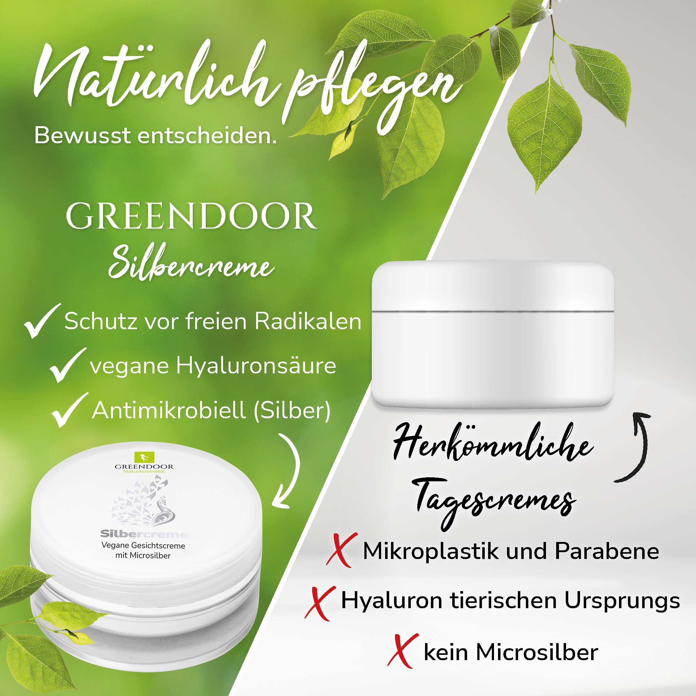 Die GREENDOOR Silbercreme ist eine hochwertige leichte Gesichtscreme, die vor allem als Tagescreme Anwendung findet. Das Besondere an dieser Tagescreme ist der Anteil an antimikrobiellem Microsilber, also reinen sehr fein vermahlenen Silberpartikeln. Aufgrund der Partikelgröße des Mikro Silbers dringt dieses nicht in tiefere Hautschichten ein, sondern entfaltet seine antimikrobielle Wirkung auf der Hautoberfläche. Silber schützt nachweislich gegen eine Bandbreite verschiedenster Keime, Bakterien und Pilze und kann so Entzündungen, Rötungen und Hautirritationen entgegen wirken. Bereits im Mittelalter setzte man bei Kopfoperationen Patienten Silbermünzen in die Schädeldecke ein, um den Heilungsprozess zu unterstützen. Ebenso werden Verbände mit Silberionen erfolgreich bei der Wundversorgung im Krankenhaus und in der ambulanten Pflege verwendet.