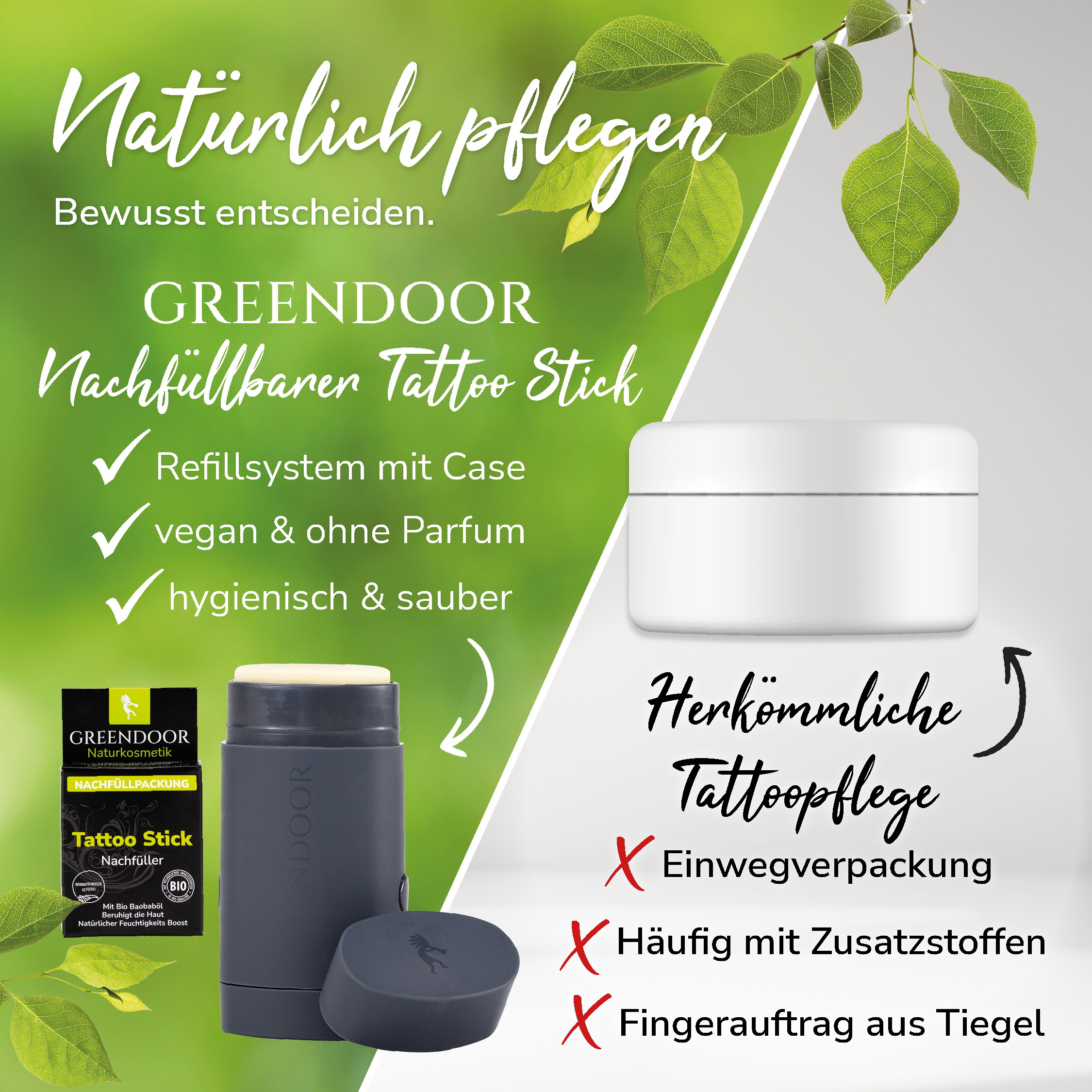 Erhalte die Schönheit deiner Tattoos! Alles, was du dafür tun musst, ist deine Tattoos mit der richtigen Mischung natürlicher bester pflanzlicher Öle und Buttern zu pflegen. Entdecke dafür das GREENDOOR Tattoobutter Nachfüllsystem – die perfekte Kombination aus modernem stilvollem Design, Top Pflege vom Naturkosmetik Spezialisten, Hygiene und Umweltbewusstsein. Diese innovative Tattoopflege mit Bio Babassubutter setzt neue Maßstäbe in der nachhaltigen Tattoopflege.